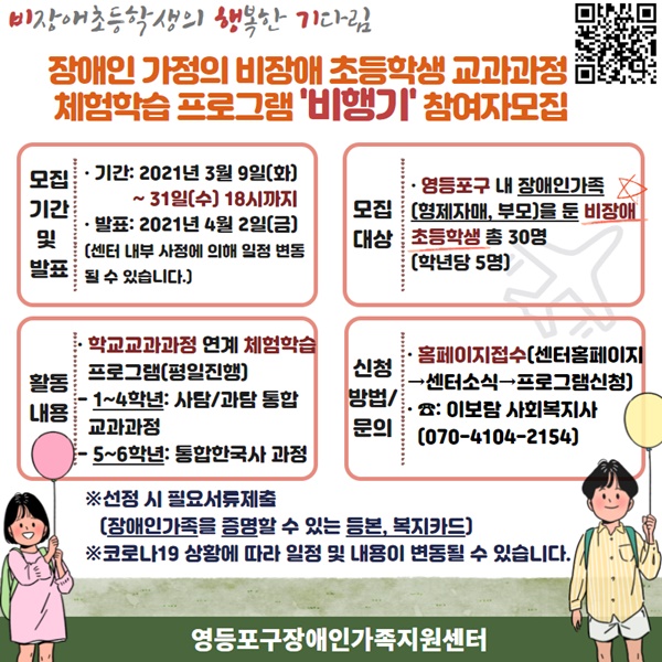 비.행.기(비장애초등학생의 행복한 기다림) 프로그램 안내지.ⓒ영등포구장애인가족지원센터 에이블포토로 보기▲ 비.행.기(비장애초등학생의 행복한 기다림) 프로그램 안내지.ⓒ영등포구장애인가족지원센터영등포구장애인가족지원센터가 영등포구 내 거주하는 장애인 가정의 비장애 초등학생을 대상으로 교과과정 체험학습 프로그램 ‘비.행.기(비장애초등학생의 행복한 기다림)’ 프로그램 참가자를 오는 31일까지 모집한다.