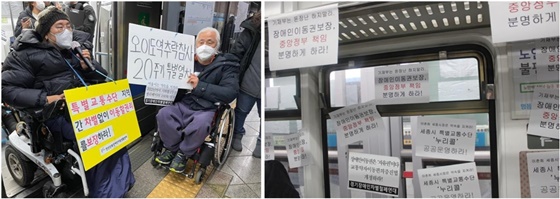‘오이도역 추락 참사 20주기 특별열차’에서 내리며 소감을 밝히는 활동가 모습들(좌측). 장애인 이동권 보장 선전물들이 지하철 4호선 전동차 안에 붙여진 모습(우측).ⓒ전국장애인차별철폐연대, 에이블뉴스 DB 에이블포토로 보기▲ ‘오이도역 추락 참사 20주기 특별열차’에서 내리며 소감을 밝히는 활동가 모습들(좌측). 장애인 이동권 보장 선전물들이 지하철 4호선 전동차 안에 붙여진 모습(우측).ⓒ전국장애인차별철폐연대, 에이블뉴스 DB이들의 노력으로 역사마다 엘리베이터가 갖춰져 지하철 접근성이 조금씩 개선됐지만, 아직도 안정성에 문제가 있는 휠체어 리프트 설치한 역사가 존재했다. 전동차와 승강장 사이 간격이 넓고 단차(승강장 연단과 차량 바닥면의 높이차)가 큰 문제도 있었다.