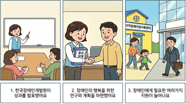 한국장애인개발원은 작년에 장애인 정책을 만들기 위해 42건의 연구 보고서를 냈어요. 장애인이 일하는 카페와 편의점을 만들어서 장애인이 일할 수 있는 곳도 늘렸어요. 다니기 편한 건물이라는 것을 증명해 주는 일도 600건 넘게 했어요. 발달장애인을 돕는 센터도 전국 곳곳에 만들어서 장애인의 권리를 지키는 데 힘썼어요.