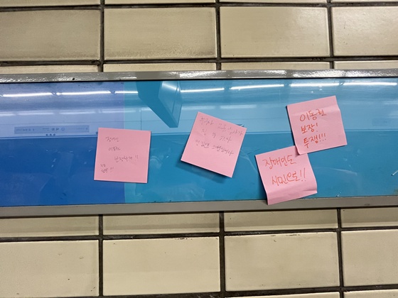 19일 오전 8시 서울 혜화역 승강장에서 진행된 1,000일차 ‘출근길 지하철 선전전’에 연대한 사람들의 목소리가 포스트잇에 적혀 혜화역 곳곳에 붙여졌다. ©전국장애인차별철폐연대