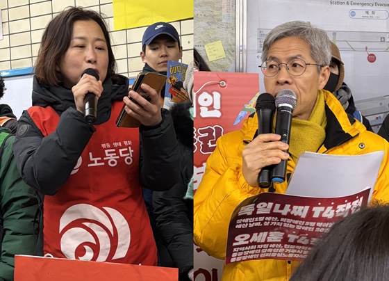 19일 오전 8시 서울 혜화역 승강장에서 진행된 1,000일차 ‘출근길 지하철 선전전’에서 발언하는 고유미 노동당 공동대표(왼쪽)와 권영국 정의당 대표. ©전국장애인차별철폐연대