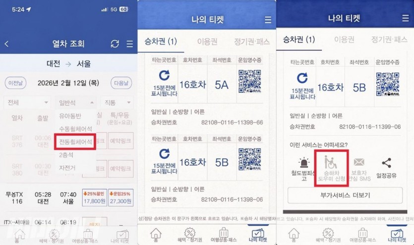 코레일 앱 좌석 예약 화면. (왼쪽) 좌석 예약 시 전동휠체어석을 선택해 따로 예약해야 한다. (가운데) 2인 이상이 함께 예약을 진행할 시, 하나의 탑승권에 좌석이 같이 표기된다. (오른쪽) 휠체어석을 예약하면 승하차 지원을 별도로 신청하는 버튼을 눌러야 한다.