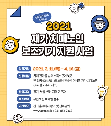 에이블포토로 보기▲ ‘2021 재가 치매노인 보조기기 지원사업’ 포스터. ⓒ경기도재활공학서비스연구지원센터경기도재활공학서비스연구지원센터(센터장 강인학)가 오는 4월 16일까지 아름다운재단과 함께하는 ‘2021 재가 치매노인 보조기기 지원사업’ 신청 대상자를 모집한다.