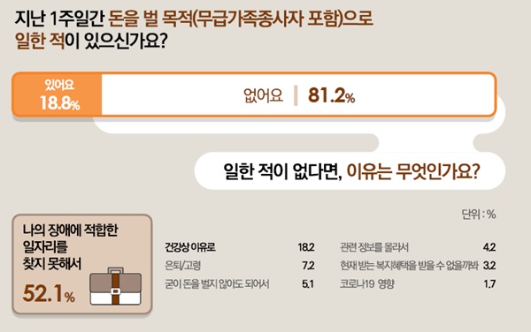 미취업 상태에 있는 1232명에게 돈을 버는 일을 하고 있지 않은 이유를 질문한 결과, ‘나의 장애에 적합한 일자리를 찾지 못해서’가 52.1%에 달했으며, 그 다음으로 ‘건강상 이유로’(18.2%), ‘은퇴/고령’(7.2%) 등의 순으로 나타났다.