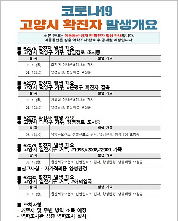 일산서구 소재 교회 관련 확진자는 20일 고양시 1명이 추가되어 누계로 총 22명의 확진자가 발생했다. 또한 오늘 확진자가 발생한 일산동구 소재 수출업체 직원 41명을 대상으로 전수검사를 시행했다. 이밖에 파주시 보건소에서 덕양구에 거주하는 고양시민 2명이 확진판정 받았다.