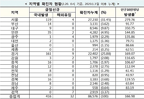 한편, 질병관리청 중앙방역대책본부는 20일 0시 기준으로 국내 발생 신규 확진자는 416명, 해외유입 사례는 32명이 확인되어 총 누적 확진자 수는 86,576명(해외유입 6,869명)이라고 밝혔다.