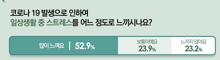 코로나19 발생으로 52.9%가 일상생활 중 스트레스를 느끼고 있었다.ⓒ서울시복지재단 에이블포토로 보기▲ 코로나19 발생으로 52.9%가 일상생활 중 스트레스를 느끼고 있었다.ⓒ서울시복지재단조사결과, 최근 코로나19 발생으로 52.9%가 일상생활 중 스트레스를 느끼고 있었으며, 연령별로는 30-39세가 38.3%로 가장 높았다. 장애유형별로는 호흡기장애(63.6%), 신장장애(61%)에서 다른 장애유형에 비해 비교적 높은 편이었다.