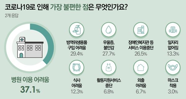 코로나19로 인해 가장 불편했던 점에 대해 질문한 결과, 병원 이용이 어려움이 37.1%로 가장 높았다.ⓒ서울시복지재단 에이블포토로 보기▲ 코로나19로 인해 가장 불편했던 점에 대해 질문한 결과, 병원 이용이 어려움이 37.1%로 가장 높았다.ⓒ서울시복지재단코로나19로 인해 가장 불편했던 점에 대해 질문한 결과, 병원 이용이 어려움이 37.1%로 가장 높았고, 방역위생용품 구입 어려움(29.4%), 우울증, 불안감(27.7%) 등의 순으로 나타났다.