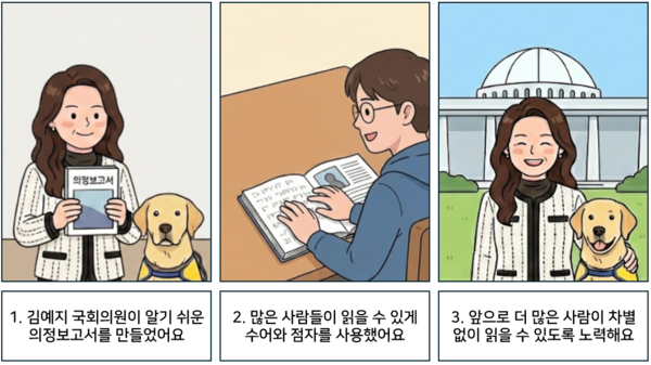 1 김예지 국회의원이 알기 쉬운 의정보고서를 만들었어요. 2 많은 사람들이 읽을 수 있게 수어와 점자를 사용했어요. 3 앞으로 더 많은 사람이 차별 없이 읽을 수 있도록 노력해요. ©AI 편집실