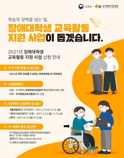'2021년 장애대학생 교육활동 지원 사업' 포스터.ⓒ교육부 에이블포토로 보기▲ '2021년 장애대학생 교육활동 지원 사업' 포스터.ⓒ교육부신종 코로나바이러스 감염증(코로나19) 장기화에 따라 올해 교육당국이 장애대학생에 대한 원격수업 지원을 강화한다. 학생들의 이동이나 강의 대필, 수화통역 등을 지원하는 교육지원인력의 지원단가도 현실화한다.