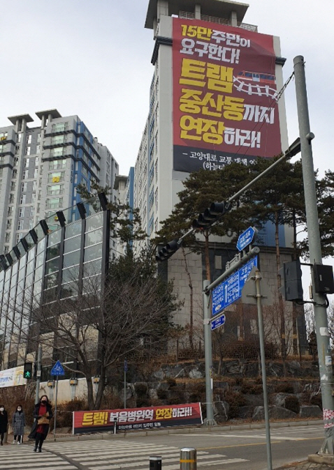 이에 중산동 하늘마을1·2·6단지와 일산센트럴아이파크, 산들마을2단지 등 주민들은 단지별 교통대책위원회를 만들고 이들의 연합체인 ‘고양대로 교통대책 연합회’를 구성, 지난 23일 단지 외벽과 육교에 현수막을 걸고 간담회를 거쳐 25일부터 고양선 트램 연장 서명운동과 시위에 나섰다.