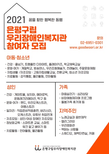 은평구립우리장애인복지관 프로그램 참여자 모집 포스터.ⓒ은평구립우리장애인복지관 에이블포토로 보기▲ 은평구립우리장애인복지관 프로그램 참여자 모집 포스터.ⓒ은평구립우리장애인복지관은평구립우리장애인복지관이 2021년 상담과 심리지원활동, 건강증진 프로그램, 문화·여가 프로그램, 일자리 지원, 정보화 교육, 치료활동 등 장애당사자의 일상을 지원할 수 있는 다양한 사업을 준비하고, 함께 할 참여자를 모집한다.