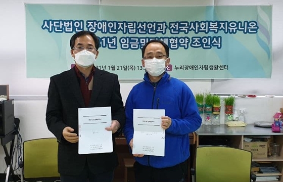 전국사회복지유니온이 지난 21일 (사)장애인자립선언과 장애인활동지원사 법정 휴일 수당 지급 등 노사협력적 새로운 모델을 마련하고자 단체협약체결 조인식을 진행했다. ⓒ전국사회복지유니온 에이블포토로 보기▲ 전국사회복지유니온이 지난 21일 (사)장애인자립선언과 장애인활동지원사 법정 휴일 수당 지급 등 노사협력적 새로운 모델을 마련하고자 단체협약체결 조인식을 진행했다. ⓒ전국사회복지유니온전국사회복지유니온이 지난 21일 (사)장애인자립선언과 장애인활동지원사 법정 휴일 수당 지급 등 노사협력적 새로운 모델을 마련하고자 단체협약체결 조인식을 진행했다.