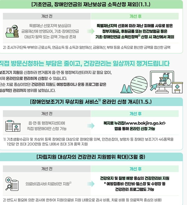 장애인 관련 정책으로는 올해부터 특별재난 선포지역 보상금을 장애인·기초연금의 소득인정액 산정에서 공제했다. 이는 태풍·홍수·대형 화재 등 자연·사회 재난으로 인한 극심한 피해로 지급받은 보상금이 금융재산으로 산정돼 장애인·기초연금 수급에서 탈락 또는 감액하는 문제가 해소되게 된다.