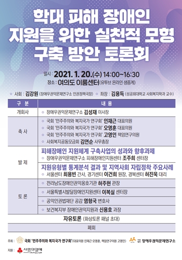 에이블포토로 보기▲ ‘학대 피해장애인 지원을 위한 실천적 모형 구축 방안’ 토론회 포스터. ⓒ장애우권익문제연구소장애우권익문제연구소(이사장 김성재, 이하 연구소)가 오는 20일 오후 2시 유튜브 채널 생중계를 통해 국회 민주주의와 복지국가 연구회(대표 인재근‧오영훈, 책임연구의원 고영인)와 함께 ‘학대 피해장애인 지원을 위한 실천적 모형 구축 방안’ 토론회를 주최한다.