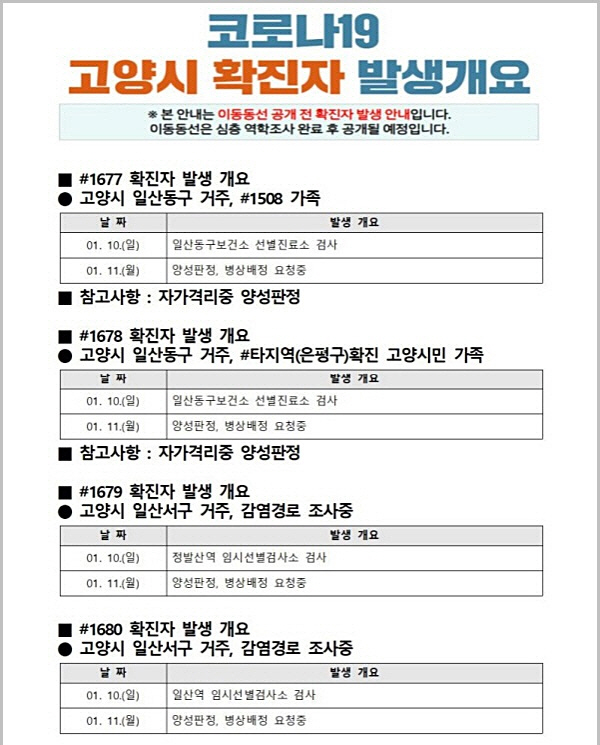 고양시, 감염경로 미상 2명 등 확진자 5명 발생 '모처럼 한 자리수'