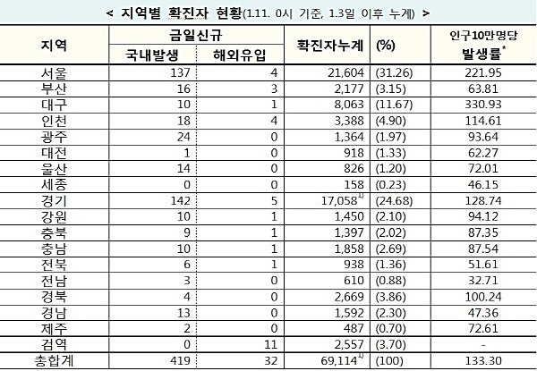 질병관리청 중앙방역대책본부는 11일 0시 기준으로 국내 발생 신규 확진자는 419명, 해외유입 사례는 32명이 확인되어 총 누적 확진자 수는 69,114명(해외유입 5,759명)이라고 밝혔다. 1월 11일(0시 기준) 국내 주요 발생 현황은 다음과 같다.