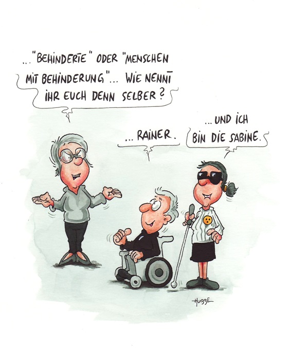 비장애인으로 보이는 왼쪽 여성이 지체장애 남성과 시각장애 여성에게 아주 진지한 표정으로 묻는다. "장애인(Behinderte)과 장애가 있는 사람(Menschen mit Behinderung)… 여러분은 도대체 스스로를 뭐라고 부르세요?" 그러자 남성은 “라이너", 여성은 "저는 사비네예요"라고 대답한다.