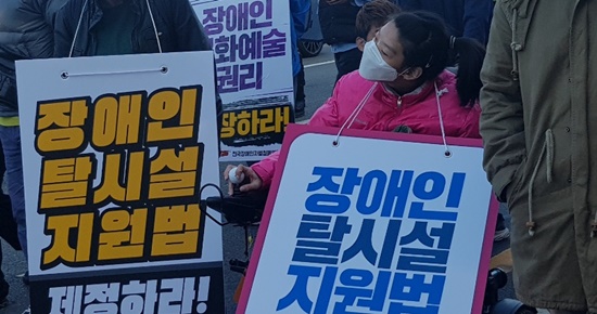 ‘장애인 탈시설지원법 제정하라’ 피켓을 든 장애인.ⓒ에이블뉴스DB 에이블포토로 보기▲ ‘장애인 탈시설지원법 제정하라’ 피켓을 든 장애인.ⓒ에이블뉴스DB
