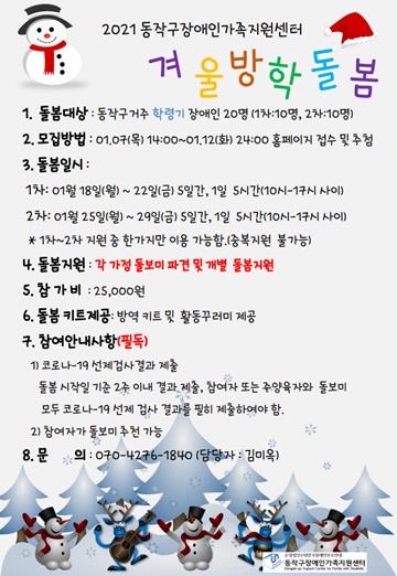 에이블포토로 보기▲ ‘2021 겨울방학 돌봄서비스’ 포스터. ⓒ동작구장애인가족지원센터동작구장애인가족지원센터가 오는 12일까지 ‘2021 겨울방학 돌봄서비스’ 참여자를 모집한다.