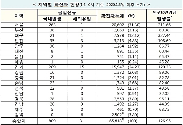 한편, 질병관리청 중앙방역대책본부는 6일 0시 기준으로 국내 발생 신규 확진자는 809명이 확인되었고, 해외유입 사례는 31명이 확인되어 총 누적 확진자 수는 65,818명(해외유입 5,569명)이라고 밝혔다. 1월 6일(0시 기준) 국내 주요 발생 현황은 다음과 같다.