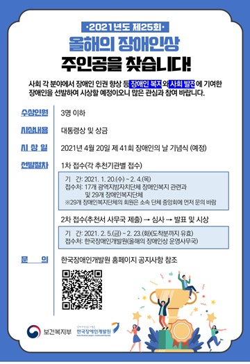 ‘2021년도 올해의 장애인상’ 수상후보자 추천 포스터.ⓒ한국장애인개발원 에이블포토로 보기▲ ‘2021년도 올해의 장애인상’ 수상후보자 추천 포스터.ⓒ한국장애인개발원한국장애인개발원이 오는 20일부터 장애인복지 및 사회발전에 기여한 장애인을 대상으로 ‘2021년도 올해의 장애인상’ 수상후보자를 추천 받는다.