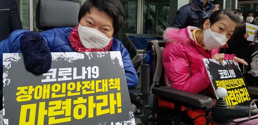 '코로나19 장애인 안전대책 마련하라' 피켓을 든 중증장애인 활동가들.ⓒ에이블뉴스DB 에이블포토로 보기▲ '코로나19 장애인 안전대책 마련하라' 피켓을 든 중증장애인 활동가들.ⓒ에이블뉴스DB