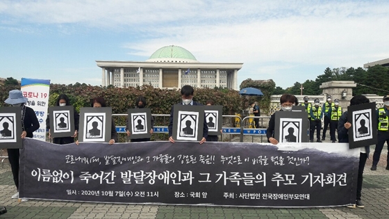 에이블포토로 보기▲ 2020년 10월 7일 국회 앞에서 전국장애인부모연대가 ‘이름 없이 죽어간 발달장애인과 그 가족들의 추모 기자회견’을 열고 있다.ⓒ에이블뉴스DB■돌봄 공백, 발달장애인 가족 비극사