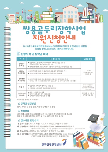 한국장애인개발원이 2021년도 쌍용곰두리장학생을 모집한다.ⓒ한국장애인개발원 에이블포토로 보기▲ 한국장애인개발원이 2021년도 쌍용곰두리장학생을 모집한다.ⓒ한국장애인개발원한국장애인개발원이 2021년도 쌍용곰두리장학생을 모집한다. 신청기간은 오는 2021년 1월 4일부터 22일까지다.