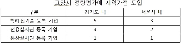 이 의원은 “인천시의 사례를 보면 인천은 지역업체의 경우 10점, 아닌 경우 0점을 부여하여 철저히 인천지역 업체만 인천지역에서 기업을 할 수 있도록 하여 지역 내 일자리 창출과 세수 확보 및 낙수 경제효과를 실천하고 있고, 실질적으로 인천지역 내 업체들의 만족도는 엄청 좋다”며 “그러나 고양시의 경우를 보면, 건설신기술 특허공법 정량평가의 지역가점 부여상황(배점표)에서 지역가점이 경기도 소재기업 5점, 서울시 소재 3점을 부여하여 단 2점 차로, 아무리 봐도 고양시 관내업체에 크게 유리한 점이 없다”고 문제 제기했다.