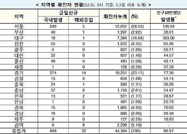 한편, 질병관리청 중앙방역대책본부는 15일 0시 기준으로 국내 발생 신규 확진자는 848명이 확인되었고, 해외유입 사례는 32명이 확인되어 총 누적 확진자 수는 44,364명(해외유입 4,962명)이라고 밝혔다. 12월 15일(0시 기준) 국내 주요 발생 현황은 다음과 같다.