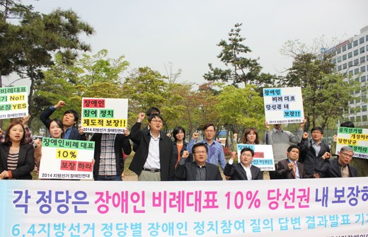 장애인비례대표 10%를 당선권 내에 보장해야 한다고 촉구하는 장애인단체.ⓒ에이블뉴스DB 에이블포토로 보기▲ 장애인비례대표 10%를 당선권 내에 보장해야 한다고 촉구하는 장애인단체.ⓒ에이블뉴스DB여기서 잠깐. 장애인 비례대표, 왜 중요하냐고요?
