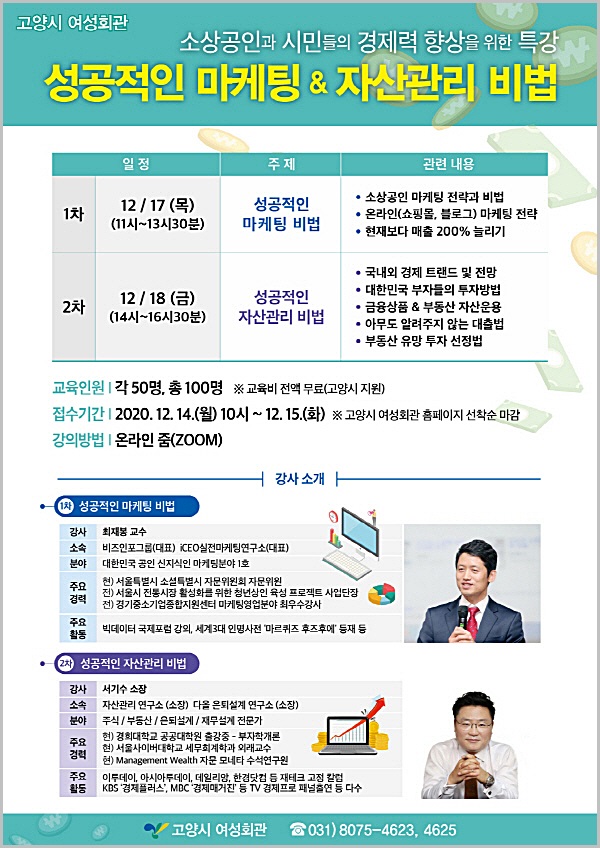 이번 온라인 특별 강좌 ‘성공적인 마케팅 & 자산관리 비법’에 대한 자세한 사항은 고양시 여성회관 홈페이지(https://wcenter.goyang.go.kr)를 참고하거나 고양시청 여성가족과 여성회관 담당자에게 전화(031-8075-4623) 문의하면 된다.