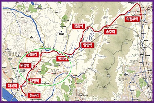 경의선 능곡역에서 경의선 의정부역을 연결하는 현재의 교외선은 1963년 관광, 군용 목적으로 개통된 노선으로 지난 수 십 년간 개발제한구역, 군사보호구역 규제 등 연선개발이 이뤄지지 않아 2004년 4월 1일 이용수요가 저조해 운행이 중지된 바 있다.