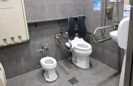 다목적화장실 출입문은 손이 불편하거나 휠체어를 사용하는 장애인이 이용하기 편한 터치식자동문이지만 내부는 문제였다.