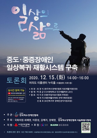 한국척수장애인협회 서울특별시협회가 오는 15일 오후 2시 서울 여의도 이룸센터 누리홀에서 ‘중도·중증장애인 일상복귀 재활시스템 구축 토론회’를 연다.ⓒ한국척수장애인협회 서울특별시협회 에이블포토로 보기▲ 한국척수장애인협회 서울특별시협회가 오는 15일 오후 2시 서울 여의도 이룸센터 누리홀에서 ‘중도·중증장애인 일상복귀 재활시스템 구축 토론회’를 연다.ⓒ한국척수장애인협회 서울특별시협회한국척수장애인협회 서울특별시협회가 오는 15일 오후 2시 서울 여의도 이룸센터 누리홀에서 ‘중도·중증장애인 일상복귀 재활시스템 구축 토론회’를 연다.