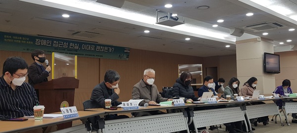 한국장애인단체총연맹은 8일 서울 여의도 이룸센터에서 ’장애인 접근성 현실, 이대로 괜찮은가‘ 토론회를 개최했다.ⓒ에이블뉴스 에이블포토로 보기▲ 한국장애인단체총연맹은 8일 서울 여의도 이룸센터에서 ’장애인 접근성 현실, 이대로 괜찮은가‘ 토론회를 개최했다.ⓒ에이블뉴스“울퉁불퉁한 흙길로 휠체어 사용 장애인은 누군가의 도움을 받지 않으면 위험해요”, “리프트가 있었지만, 배터리가 방전돼 공중에 10분간 멈춰 있었어요.”