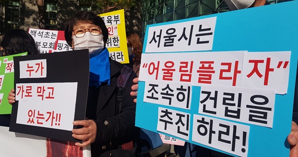 ‘서울시는 조속히 어울림플라자 건립을 추진하라’ 피켓을 든 서울장애인부모연대 회원들.ⓒ에이블뉴스DB 에이블포토로 보기▲ ‘서울시는 조속히 어울림플라자 건립을 추진하라’ 피켓을 든 서울장애인부모연대 회원들.ⓒ에이블뉴스DB