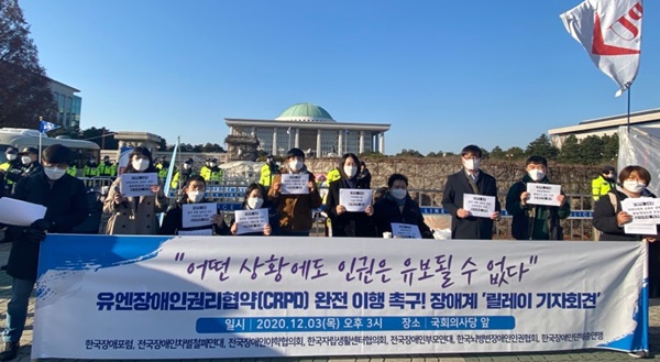 한국장애포럼, 전국장애인차별철폐연대 등 7개 단체는 3일 국회 앞에서 유엔장애인권리협약(CPRD) 완전 이행을 촉구하는 릴레이 기자회견을 개최했다.ⓒ전국장애인차별철폐연대 에이블포토로 보기▲ 한국장애포럼, 전국장애인차별철폐연대 등 7개 단체는 3일 국회 앞에서 유엔장애인권리협약(CPRD) 완전 이행을 촉구하는 릴레이 기자회견을 개최했다.ⓒ전국장애인차별철폐연대‘세계 장애인의 날’을 맞아 장애계가 정부와 국회에 완전한 유엔장애인권리협약(UN CRPD) 완전 이행을 위한 교육권, 탈시설-자립생활, 노동권, 이동권 보장은 물론, 12년 넘게 지지부진 중인 선택의정서 비준도 압박했다.