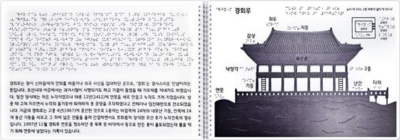 이에 문화재청 경복궁 관리소와 협업해 근정전, 경회루, 향원정 등 경복궁의 문화유산을 3D 프린트를 활용한 적층형 인쇄 기법을 적용해 촉각그림을 디자인하고 시각장애인을 대상으로 촉각그림과 점·묵자 표기에 대한 의견을 수렴해 디자인을 완성했다.