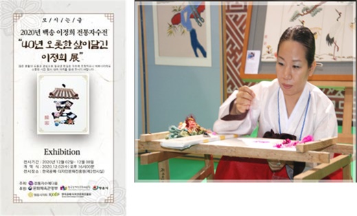 장애인 자수공예가 이정희 작가가 오는 12월 2일부터 8일까지 서울 인사동 한국공예디자인문화진흥원(KCDF) 제2전시실에서 40년 삶의 담긴 2020년 백송 이정희 전통자수전을 연다. ⓒ한국장애예술인협회 에이블포토로 보기▲ 장애인 자수공예가 이정희 작가가 오는 12월 2일부터 8일까지 서울 인사동 한국공예디자인문화진흥원(KCDF) 제2전시실에서 40년 삶의 담긴 2020년 백송 이정희 전통자수전을 연다. ⓒ한국장애예술인협회장애인 자수공예가 이정희 작가가 오는 12월 2일부터 8일까지 서울 인사동 한국공예디자인문화진흥원(KCDF) 제2전시실에서 40년 삶의 담긴 2020년 백송 이정희 전통자수전을 연다.