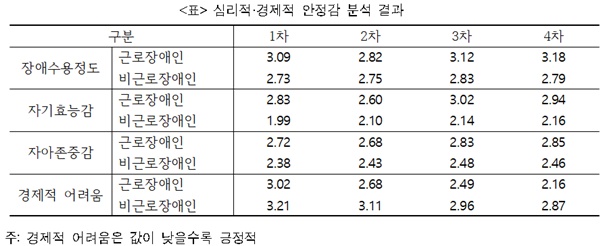심리적·경제적 안정감 분석 결과.ⓒ한국장애인고용공단 고용개발원 에이블포토로 보기▲ 심리적·경제적 안정감 분석 결과.ⓒ한국장애인고용공단 고용개발원특히 심리적 요인인 장애수용정도, 자기효능감, 자아존중감은 패널조사 시점인 1차(2016년)∼4차(2019년) 연도까지 근로 장애인의 경우 상승 추세이고, 비근로 장애인에 비해 평균값도 높게 나타났다.