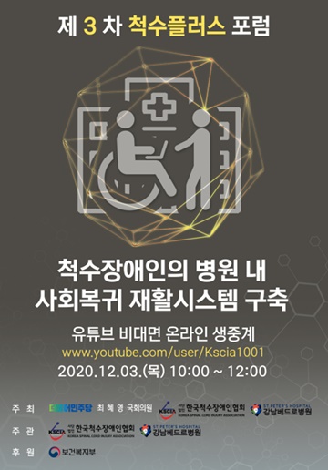 제3차 척수플러스 포럼 포스터.ⓒ한국척수장애인협회 에이블포토로 보기▲ 제3차 척수플러스 포럼 포스터.ⓒ한국척수장애인협회한국척수장애인협회가 오는 12월 3일 오전 10시 ‘제3차 척수플러스 포럼_척수장애인 병원 내 사회복귀 재활시스템 구축 세미나’를 온라인(유튜브)으로 개최한다.