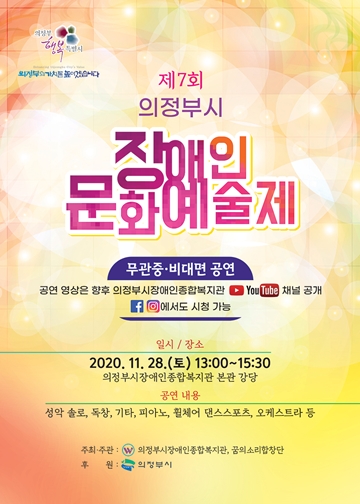 ‘제7회 의정부시장애인문화예술제’ 포스터. ⓒ의정부시장애인종합복지관 에이블포토로 보기▲ ‘제7회 의정부시장애인문화예술제’ 포스터. ⓒ의정부시장애인종합복지관의정부시장애인종합복지관(관장 정의철, 이하 의정부장복)이 오는 28일 복지관 강당에서 꿈의소리합창단(대표 전해철)과 ‘제7회 의정부시장애인문화예술제’ 무관중, 비대면 영상 공연을 개최한다.