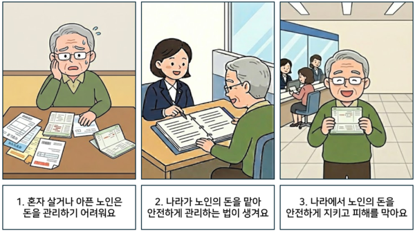 1 혼자 살거나 아픈 노인은 돈을 관리하기 어려워요. 2 나라가 노인의 돈을 맡아 안전하게 관리하는 법이 생겨요. 3. 나라에서 노인의 돈을 안전하게 지키고 피해를 막아요. ©AI 편집실