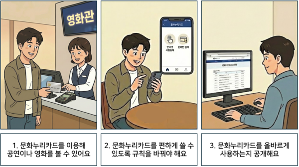 1 문화누리카드를 이용해 공연이나 영화를 볼 수 있어요. 2 문화누리카드를 편하게 쓸 수 있도록 규칙을 바꿔야 해요. 3 문화누리카드를 올바르게 사용하는지 공개해요. ©AI 편집실