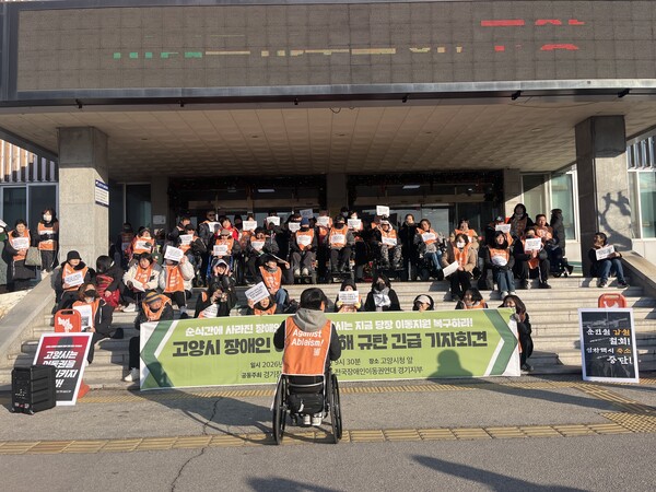 【에이블뉴스 이슬기 기자】경기장애인차별철폐연대(이하 경기장차연)이 9일 고양시청 앞에서 기자회견을 갖고, 고양시 장애인 이동권 침해를 규탄하며 즉각적인 예산 복구를 요구했다.