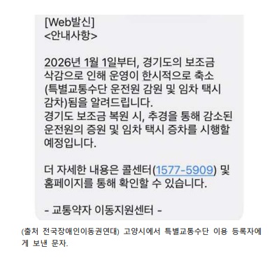 고양시에서 특별교통수단 이용 등록자에게 보낸 문자.ⓒ전국장애인이동권연대