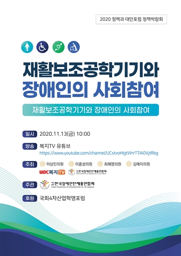 ‘재활보조공학기기와 장애인의 사회참여’ 토론회 웹자보. ⓒ한국장애인단체총연합회 에이블포토로 보기▲ ‘재활보조공학기기와 장애인의 사회참여’ 토론회 웹자보. ⓒ한국장애인단체총연합회한국장애인단체총연합회(상임대표 김락환, 이하 장총련)가 오는 13일 유튜브 생방송으로 ‘재활보조공학기기와 장애인의 사회참여’ 토론회를 개최한다.