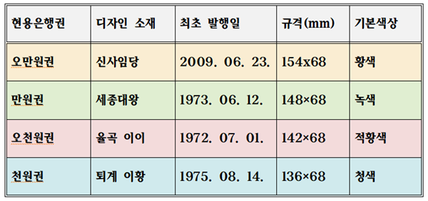 현용은행권의 모양. ⓒ한국은행에서 발췌 에이블포토로 보기▲ 현용은행권의 모양. ⓒ한국은행에서 발췌화폐에는 다른 나라도 마찬가지지만 대부분이 인물 사진이 들어 있다. 여러 가지 장치가 있지만, 인물사진도 위조 방지를 위해서란다. 천 원권 인물은 퇴계 이황이고 기본색상은 청색인데 1975년에 처음 나왔고 크기는 136x68mm다. 오천 원권은 1972년에 발행되었고 소재는 율곡 이이고 기본색상은 적황색이며 크기는 142x68이다.